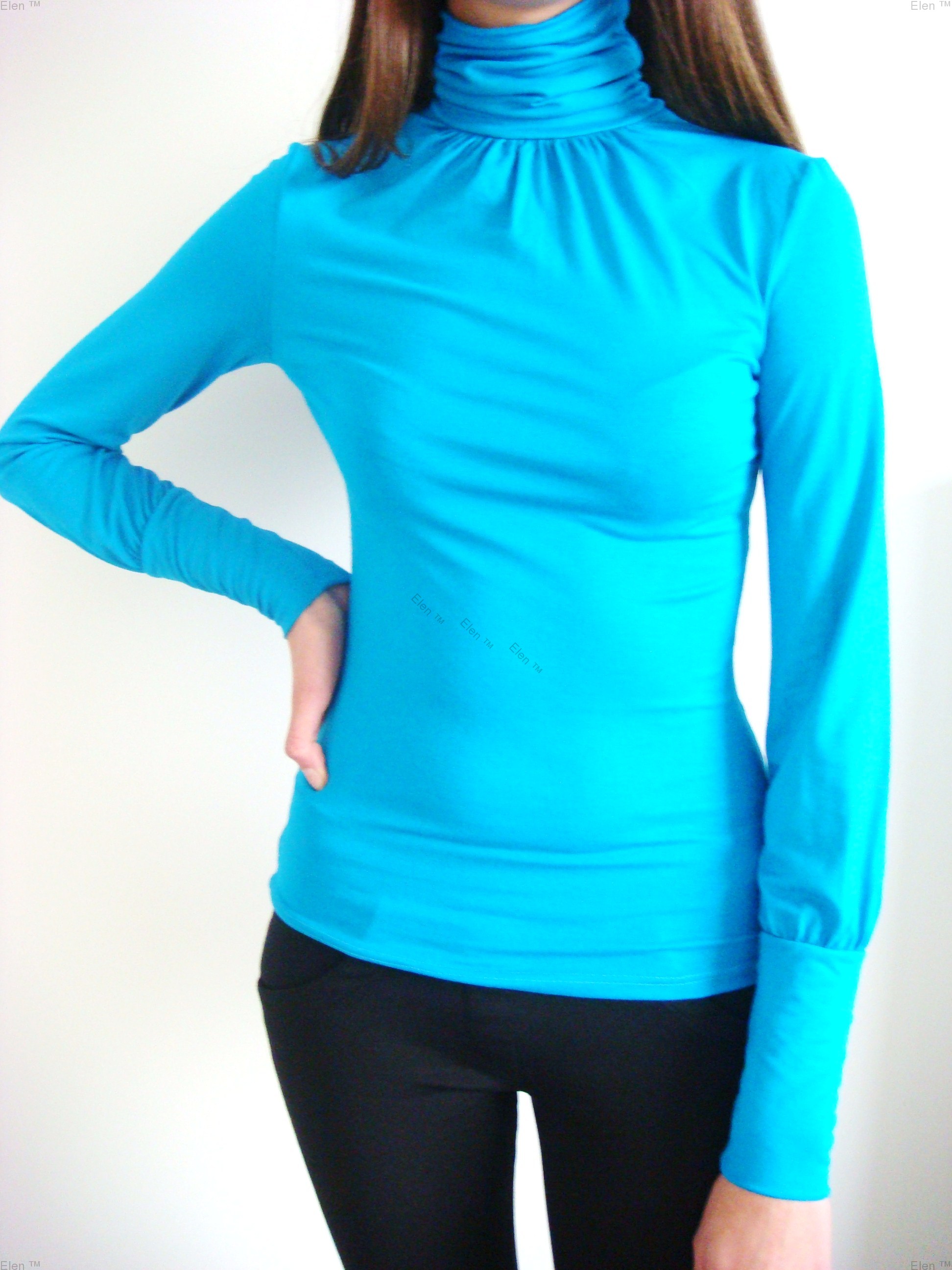 Водолазка из вискозв (вискоза+эластан). Высокая эластичность. Сборка на линии горловины спереди, свободный рукав снизу на манжете.